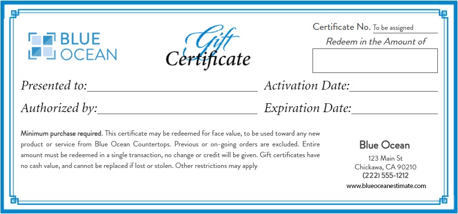 Minimum purchase required. This certificate may be redeemed for face value, to be used toward any new product or service from BLUE OCEAN. Previous or on-going orders are excluded. Entire amount must be redeemed in a single transaction, no change or credit will be given. Gift certificates have no cash value, and cannot be replaced if lost or stolen. Other restrictions may apply